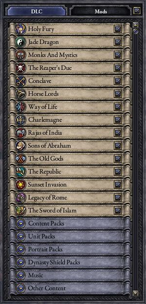 /Crusader Kings II/dlc 文件夹的DLC文件列表(粗体是扩展包名,斜体是未出现的):