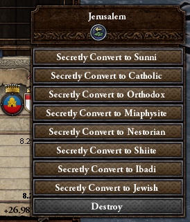 One way to secretly convert is to own a holy site of another religion. For example, the owner of Jerusalem may secretly convert to any Abrahamic religion by right-clicking the county shield.