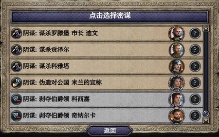 之后你可以通过决议来执行阴谋。不过谋杀角色的阴谋没有相关的决议,而是通过不时弹出事件来选择谋杀计划,同谋越多、阴谋力量越高弹出事件越频繁。