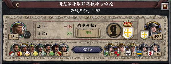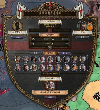 最高贡献者的受益者将获得王国头衔。 并且该受益者还会获得十字军国王/女王的特质,给予+35同宗教好感和其他好处,但没有资格参加大多数选举继承法。 仅在第一次十字军中,接收者还会得到十字军血脉。