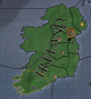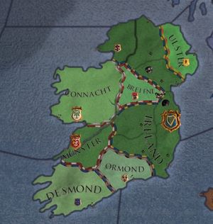The Earl of Dubhlinn will soon inherit his father's county of Laigin, which will give you enough troops to begin your conquests. The first targets for your expansion (either via claim fabrication or via the Jade Dragon casus bellis) should be Cill Dara and Osraige, since each will allow you to create a duchy after you win the war, and you will need at least two duchies to be allowed to form a kingdom. You also need seven counties to create the Kingdom of Ireland. If using claim fabrication, there are two possible approaches to getting the next three required counties: fabricate any three separate county claims, or fabricate two county claims within the de jure borders of the Petty Kingdom of Mumu, create or usurp that duchy, and then press a de jure claim on the remaining county. There's no true right or wrong way. The claim fabrications will probably have a cheaper up-front cost than duchy creation or usurpation, however if your chancellor is bad or you get bad luck, you may have amassed the money to create or usurp the ducal title before you get the third claim fabricated. Also, depending on your play style, you may find it useful to have all the duchies in your kingdom created – if you do want them all created, you will eventually have to incur the creation expense anyway.