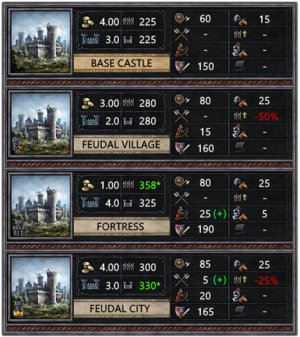The specialization also impacts the characteristics of the settlement. The artwork at the right has been done by Arko to sum up this for the castle specialization.