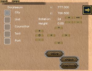 - Rotation: The four buttons to the right allow you to change the rotation of the selected Map Object. This is measured in degrees. The - and + rotate the object in 5 degree increments with the -- and ++ buttons rotate it in 45 degree increments. +/++ rotate it clockwise while -/-- rotate it anti-/counter-clockwise. For ports, 0 represents due south.